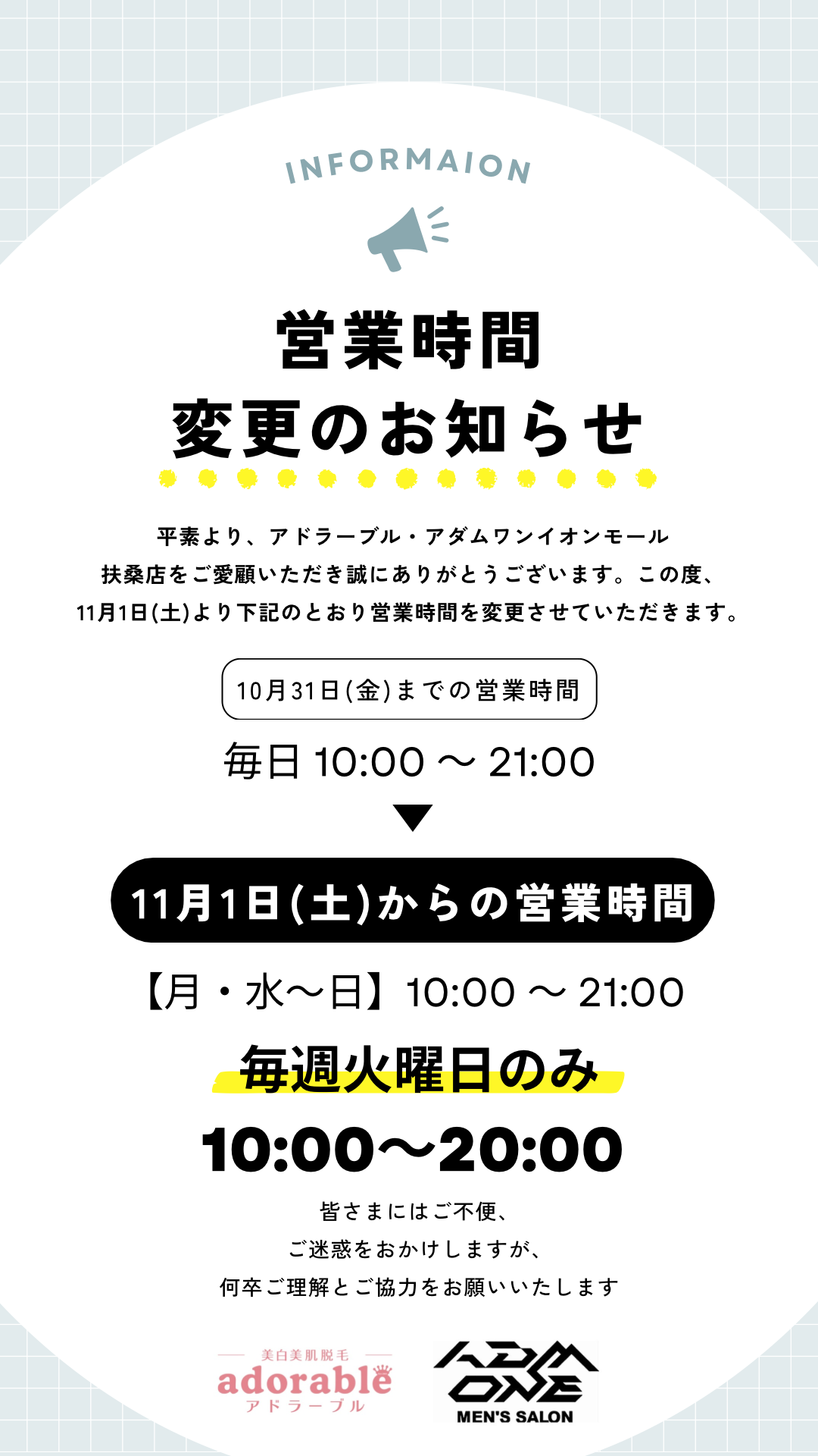 この度、11月1日(土)より下記のとおり営業時間を変更させていただきます。