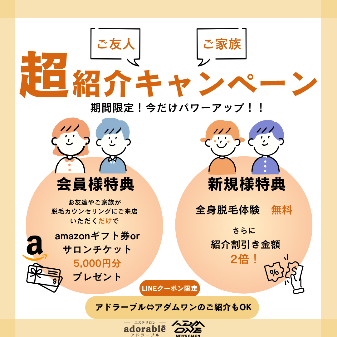 ご紹介いただいたお客様にはAmazonギフトカード5千円分or金券5千円分(adorable・ADMONEでお使いいただけるチケット)をプレゼントさせていただいております♪