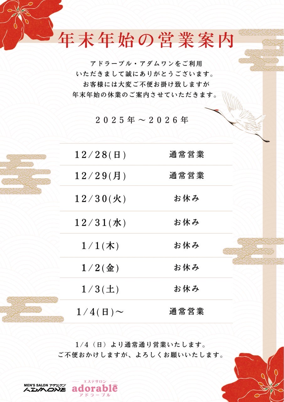 また、年末付近や年明け後はご予約が混雑が予想される為お早めのご予約取りを宜しくお願い致します。